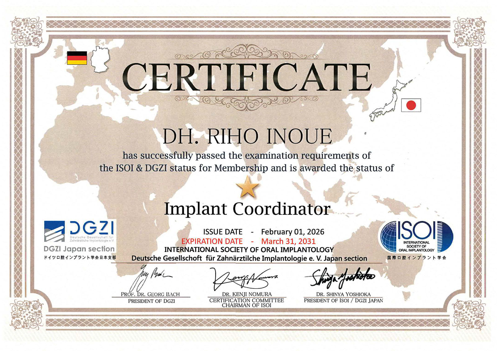| 取得資格 | インプラントコーディネーター 歯科カウンセラー |